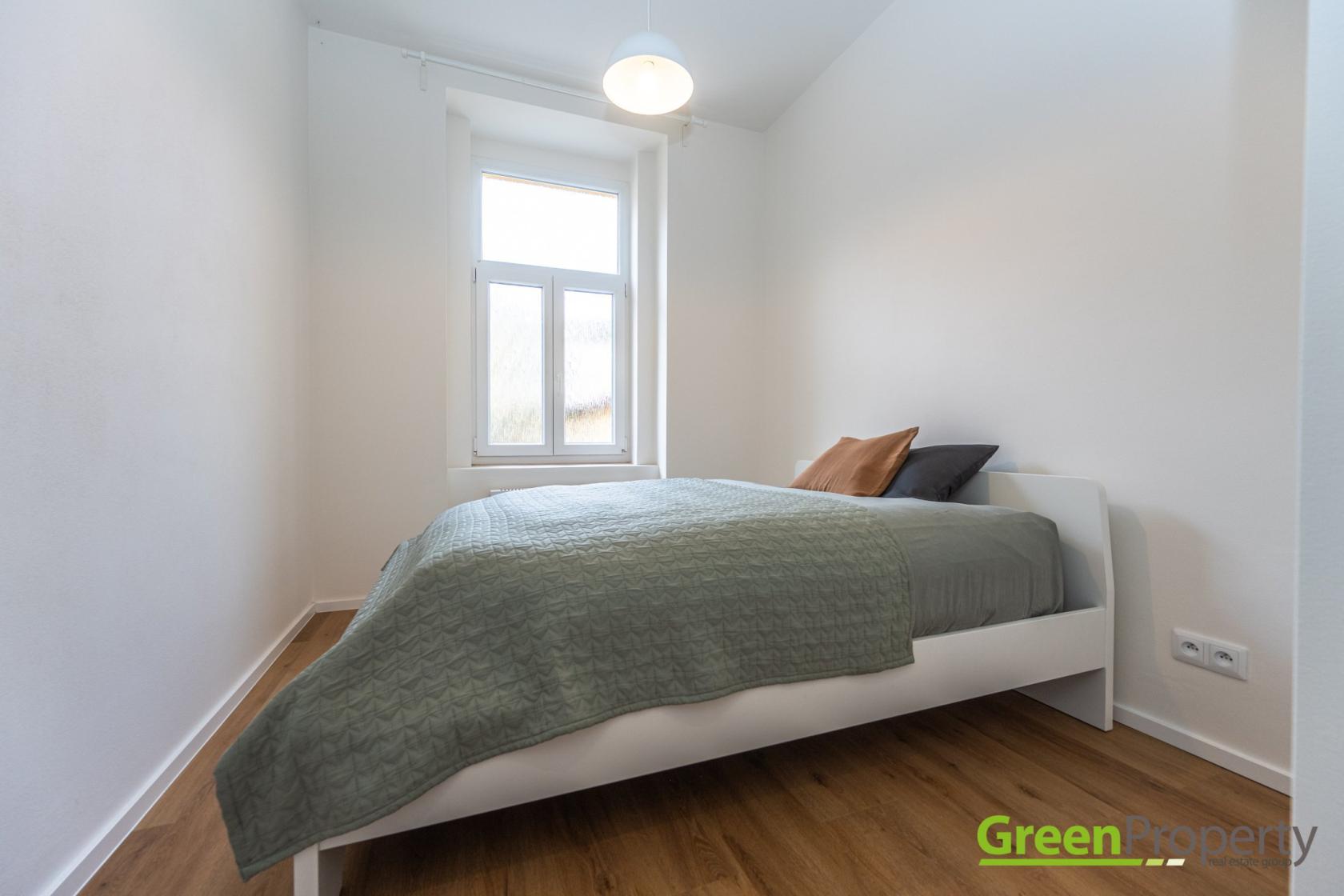 Dispozice bytu nabízí předsíň, koupelnu se sprchou a WC, pokoj s kuchyňským koutem a ložnici.
